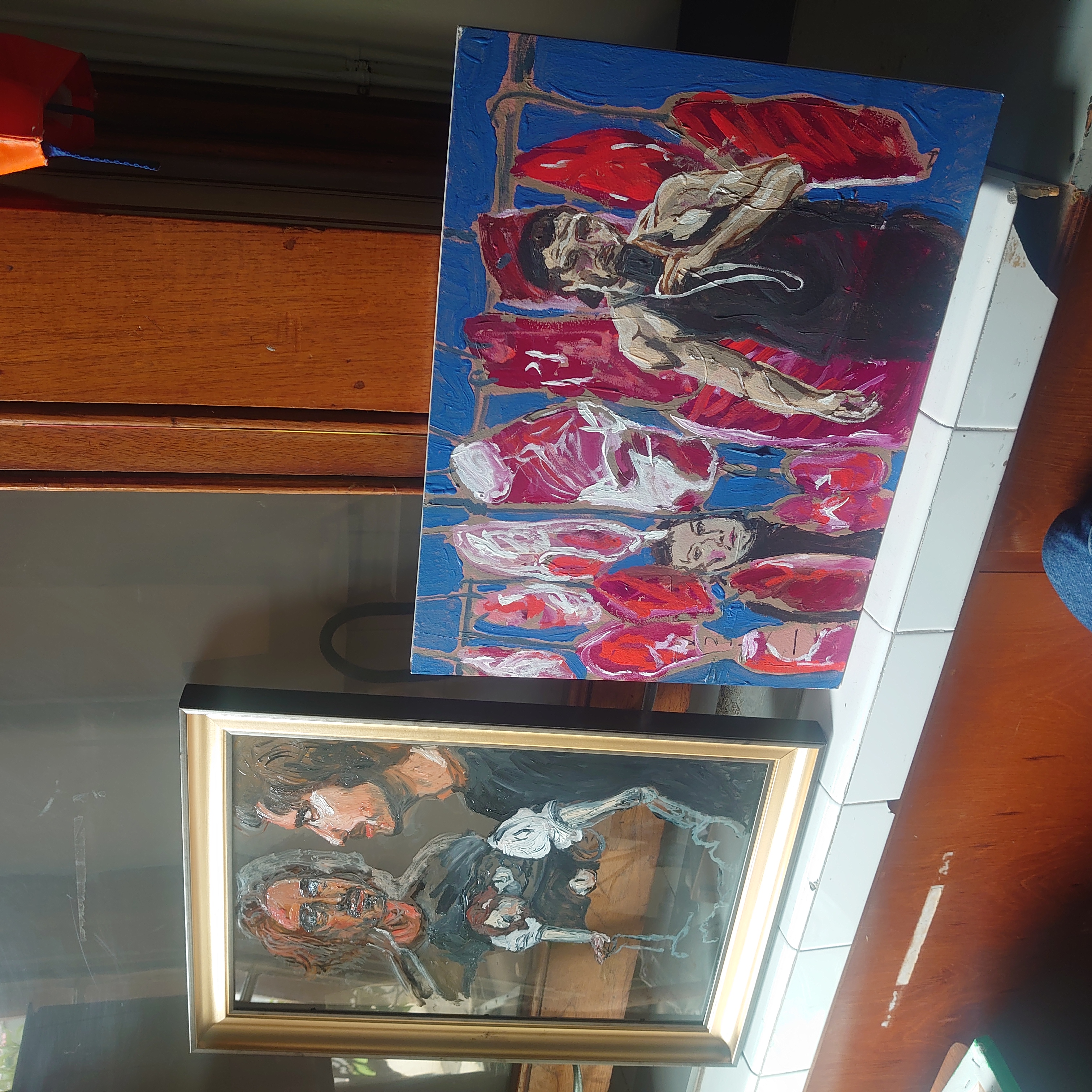 “Another Reformation Meat Diet: The Princes (Looks/Trade-off)” MMXXIII.Acrylic on (discarded) board. Photograph: Jessica Maurer.